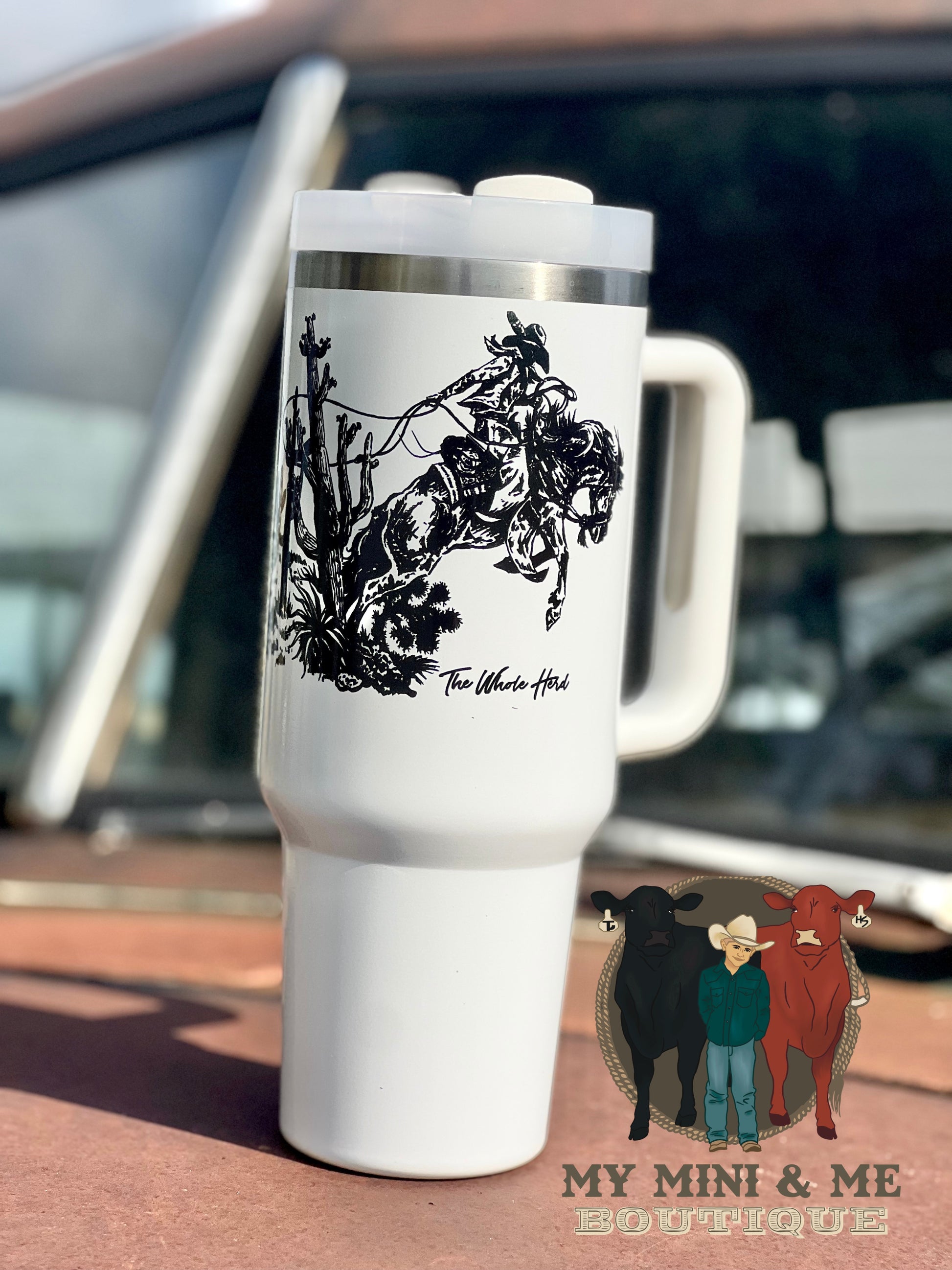 Unique hand drawn art on a stainless 40oz tumbler with handle!
